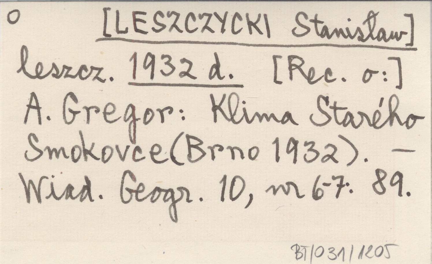 leszcz. [LESZCZYCKI Stanisław] 1932 d [Rec. o:] A. Gregor: Klima Starého Smokovce (Brno 1932).
