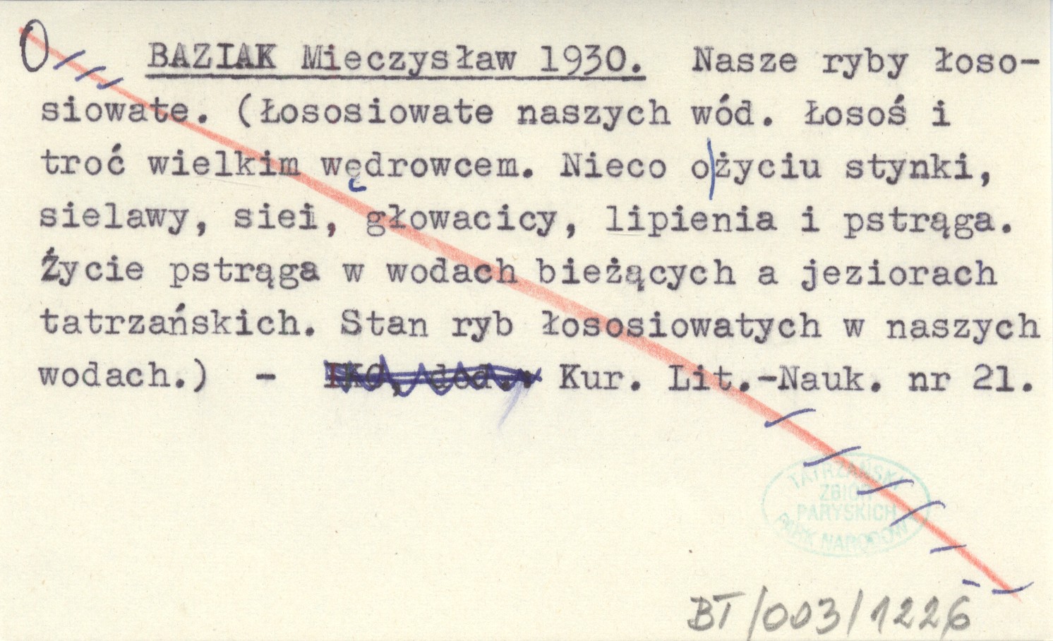 BAZIAK Mieczysław 1930 Nasze ryby łososiowate. (Łososiowate naszych wód. Łosoś i troć wielkim wędrowcem. Nieco o życiu stynki, sielawy, siei, głowacicy, lipienia i pstrąga. Życie pstrąga w wodach bieżących a jeziorach tatrzańskich. Stan ryb łososiowatych w naszych wodach).