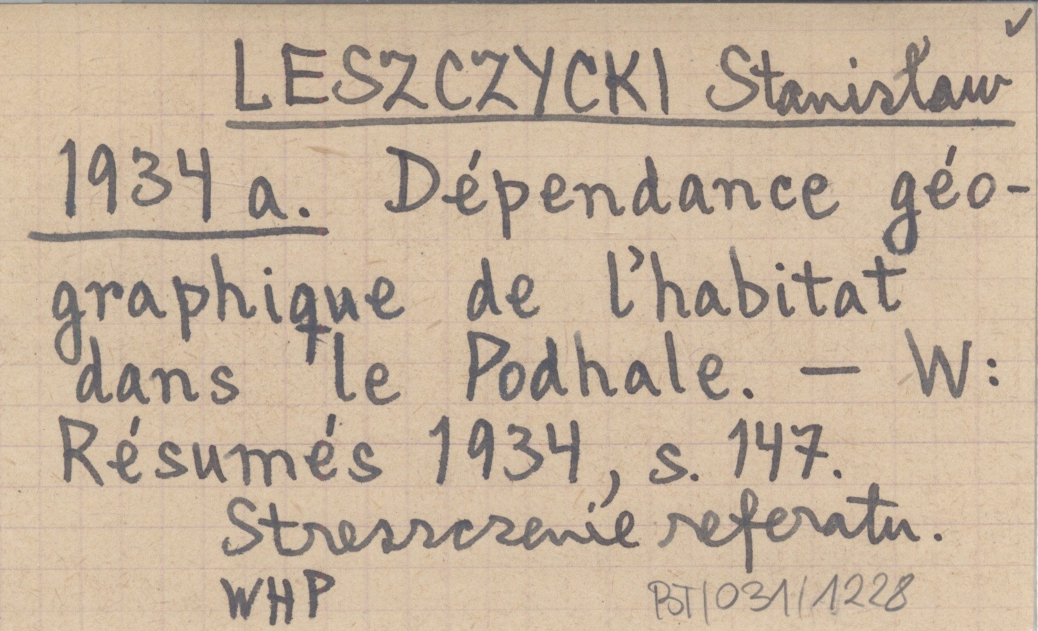 LESZCZYCKI Stanisław 1934 a Dépendance géographique de l'habitat dans le Podhale.