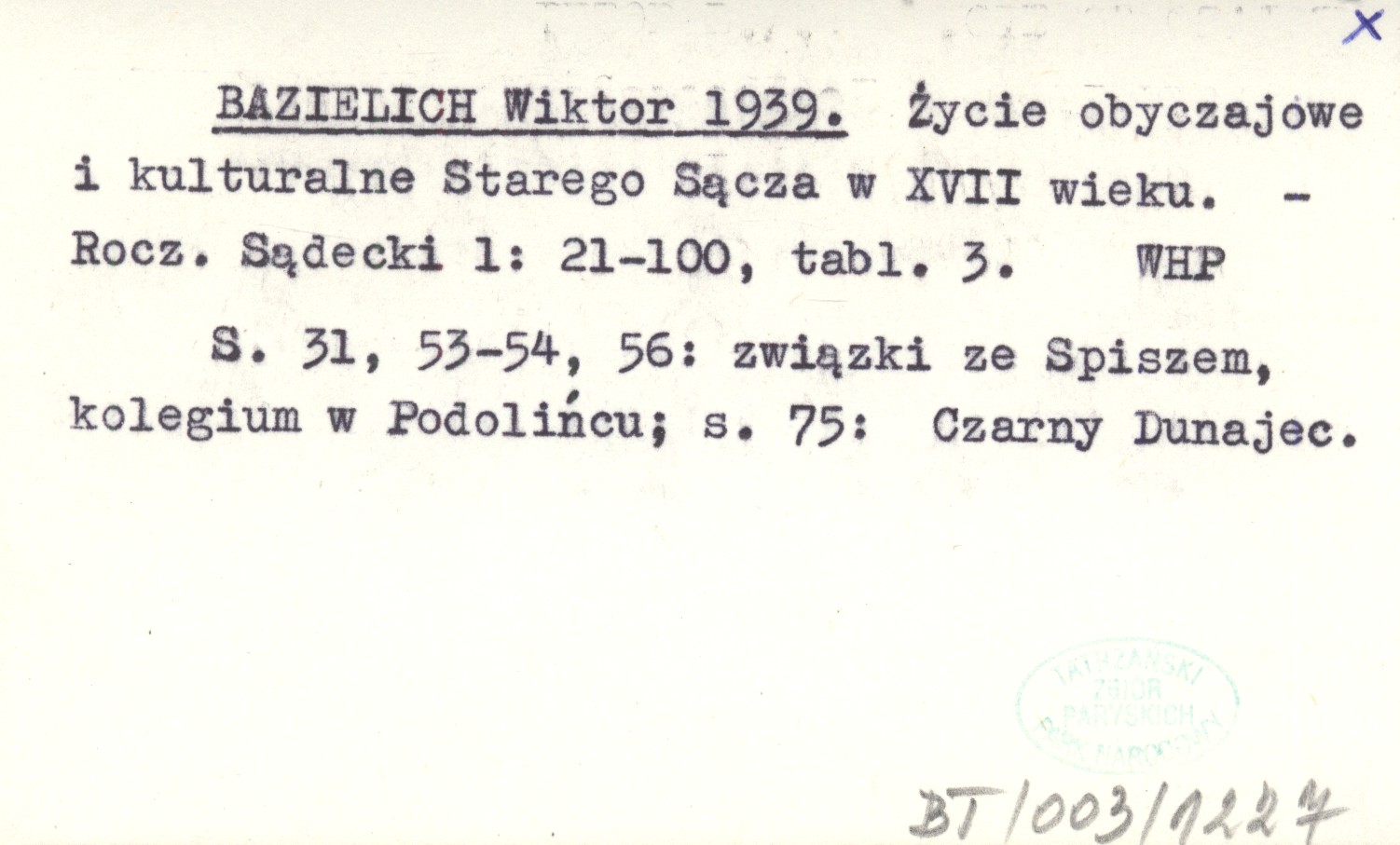 BAZIELICH Wiktor 1939 Życie obyczajowe i kulturalne Starego Sącza w XVII wieku.