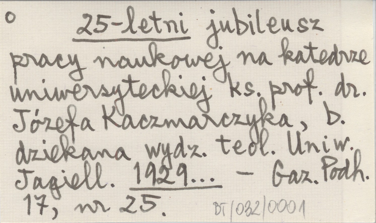 25-letni jubileusz pracy naukowej na katedrze uniwersyteckiej ks. prof. dr. Józefa Kaczmarczyka, b. dziekana wydz. teol. Uniw. Jagiell. 1929...
