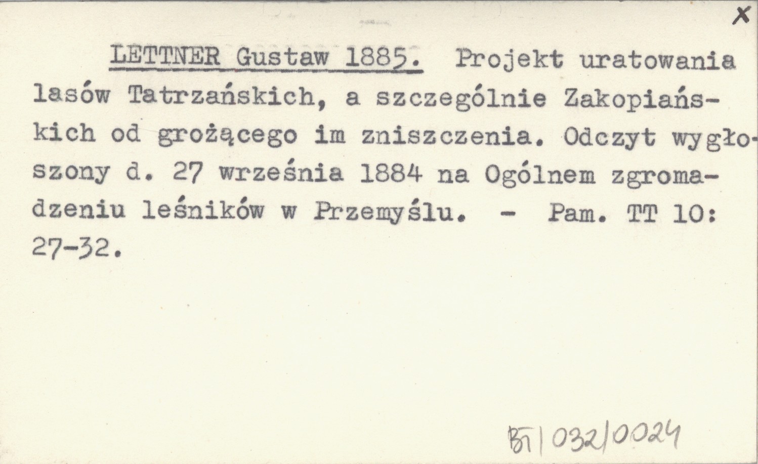 LETTNER Gustaw 1885 Projekt uratowania lasów Tatrzańskich, a szczególnie Zakopiańskich od grożącego im zniszczenia. Odczyt wygłoszony d. 27 września 1884 na Ogólnem zgromadzeniu leśników w Przemyślu.