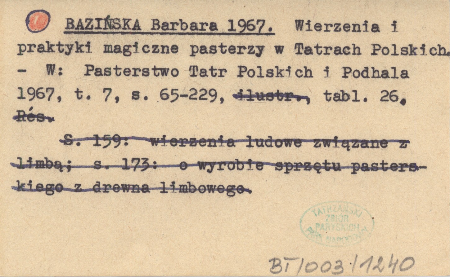 BAZIŃSKA Barbara 1967 Wierzenia i praktyki magiczne pasterzy w Tatrach Polskich.