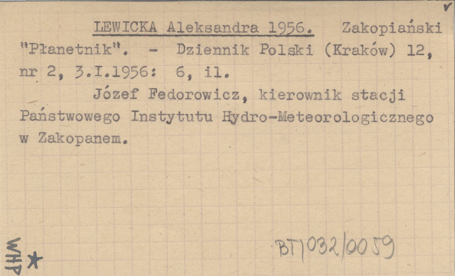 Dziennik Polski (Kraków) , 12, nr 2 (3 I 1956): 6, il. Józef Fedorowicz, kierownik stacji Państwowego Instytutu Hydro-Meteorologicznego w Zakopanem.