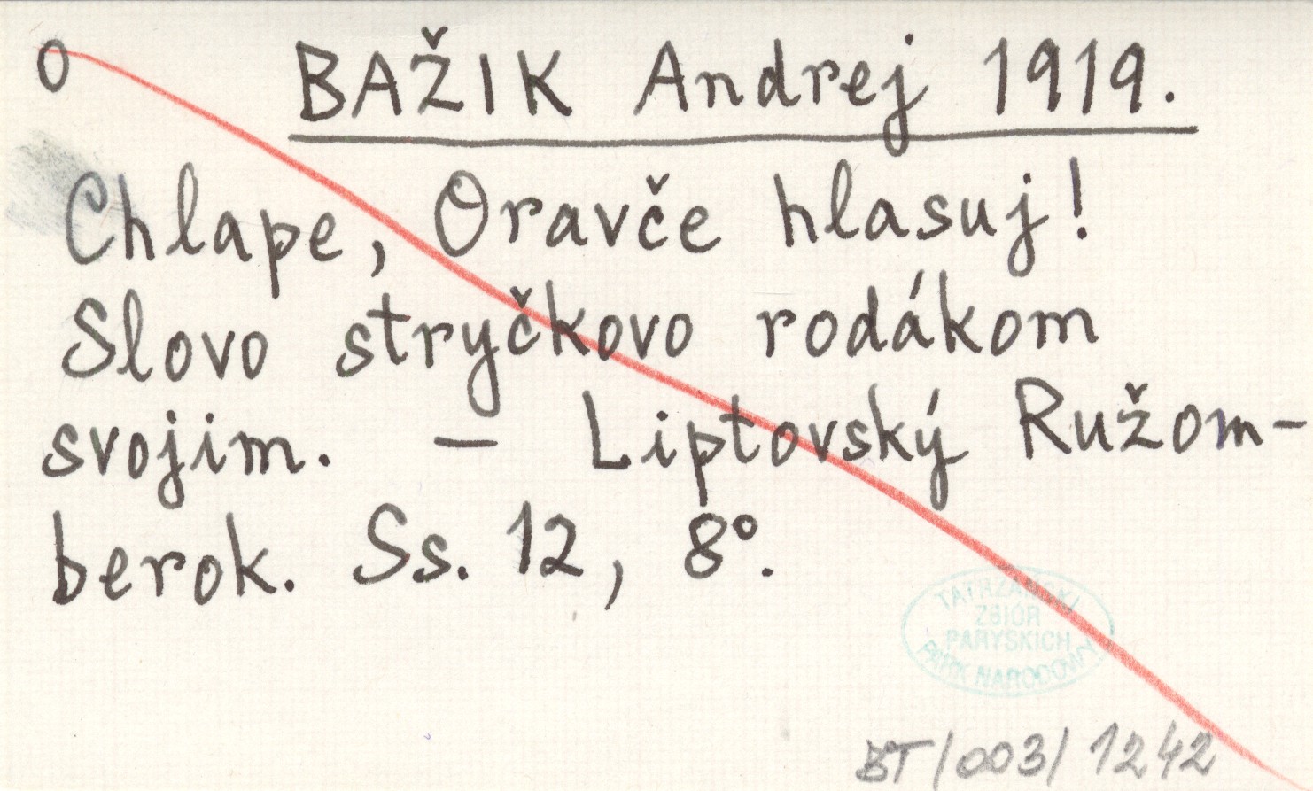 BAŽIK Andrej 1919 Chlape, Oravče hlasuj! Slovo stryčkovo rodákom svojim.