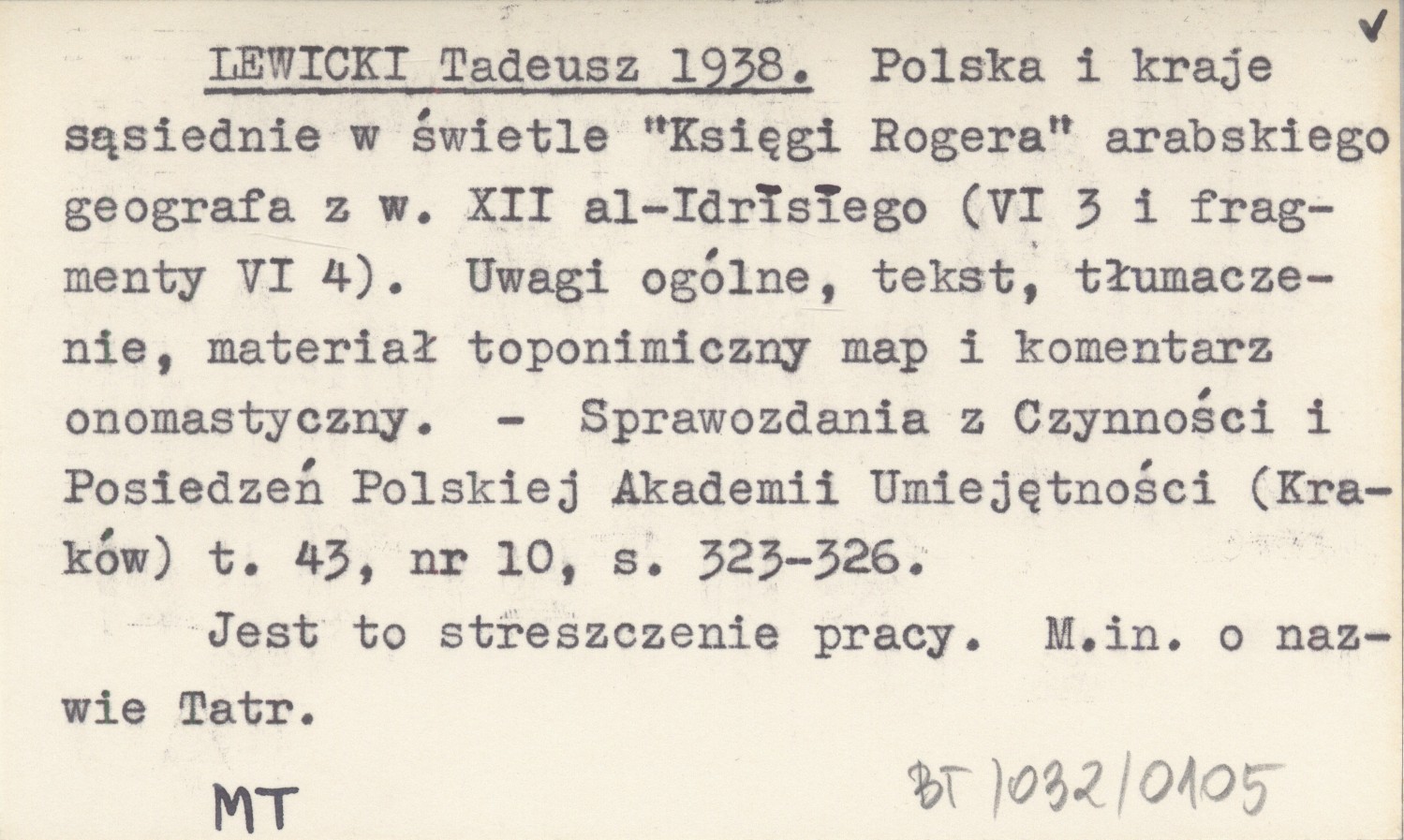 LEWICKI Tadeusz 1938 Polska i kraje sąsiednie w świetle "Księgi Rogera" arabskiego geografa z w. XII al-Idrisiego (VI 3 i fragmenty VI 4). Uwagi ogólne, tekst, tłumaczenie, materiał toponimiczny map i komentarz onomastyczny.