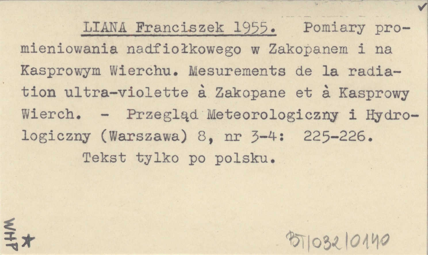 LIANA Franciszek 1955 Pomiary promieniowania nadfiołkowego w Zakopanem i na Kasprowym Wierchu. Mesurements de la radiation ultra-violette á Zakopane et á Kasprowy Wierch.