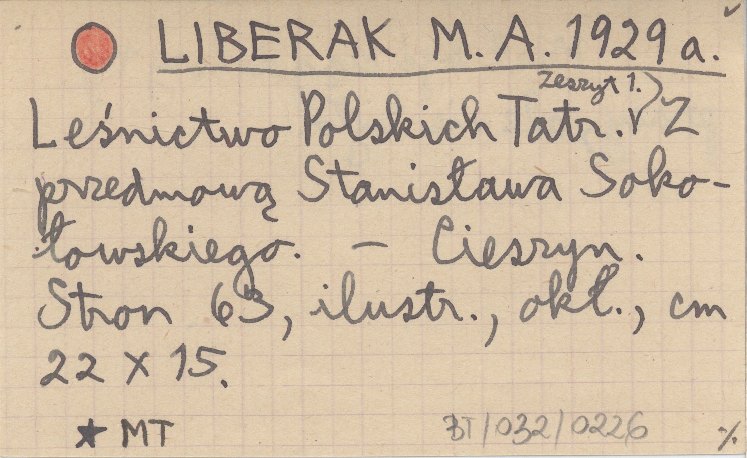 LIBERAK M. A. 1929 a Leśnictwo Polskich Tatr. Zeszyt 1. Z przedmową Stanisława Sokołowskiego.