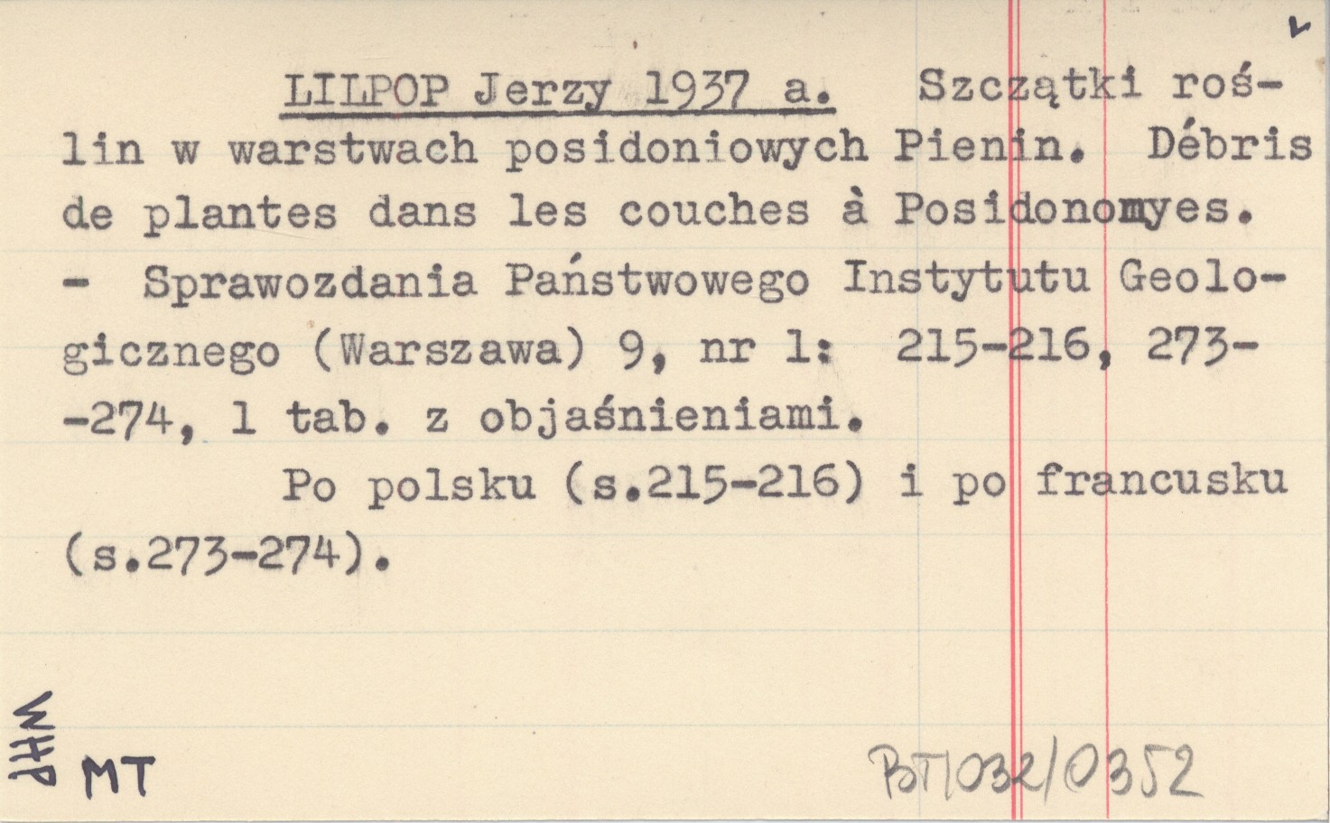 Sprawozdania Państwowego Instytutu Geologicznego (Warszawa) , 9, nr 1: 215-216, 273-274, 1 k. tabl. (obj.). Po polsku (s.215-216) i po francusku (s.273-274).