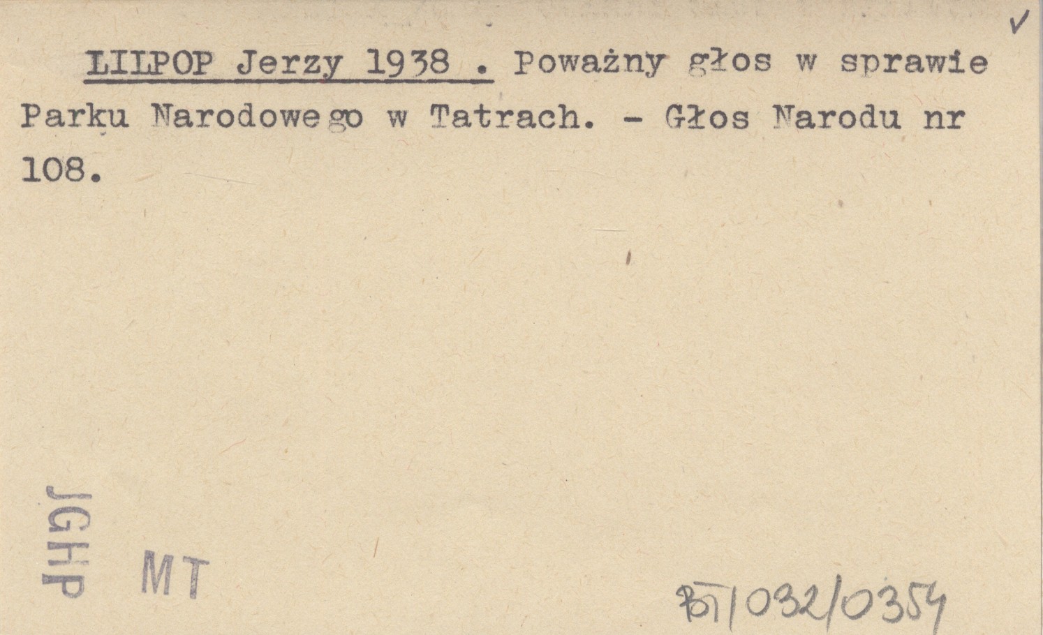 LILPOP Jerzy 1938 Poważny głos w sprawie Parku Narodowego w Tatrach.