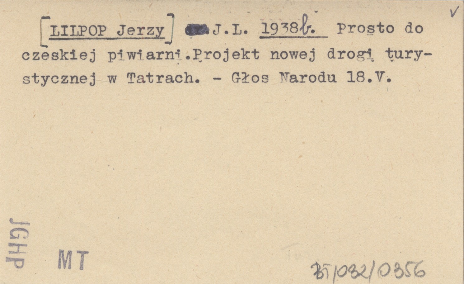J.L. [LILPOP Jerzy] 1938 b Prosto do czeskiej piwiarni.Projekt nowej drogi turystycznej w Tatrach.