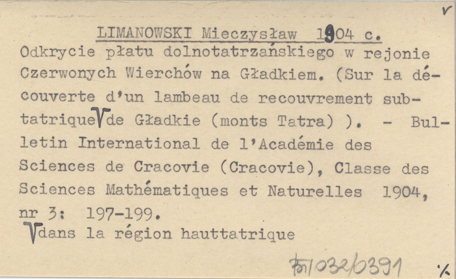 LIMANOWSKI Mieczysław 1904 c Odkrycie płatu dolnotatrzańskiego w rejonie Czerwonych Wierchów na Gładkiem. (Sur la découverte d'un lambeau de recouvrement subtatrique dans la région hauttatrique de Gładkie (monts Tatra) ).