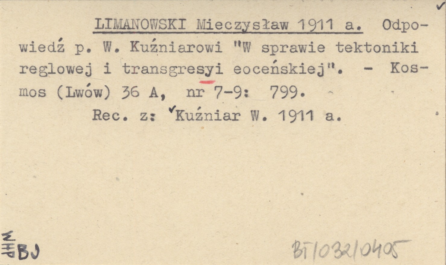 LIMANOWSKI Mieczysław 1911 a Odpowiedź p. W. Kuźniarowi "W sprawie tektoniki reglowej i transgresyi eoceńskiej".