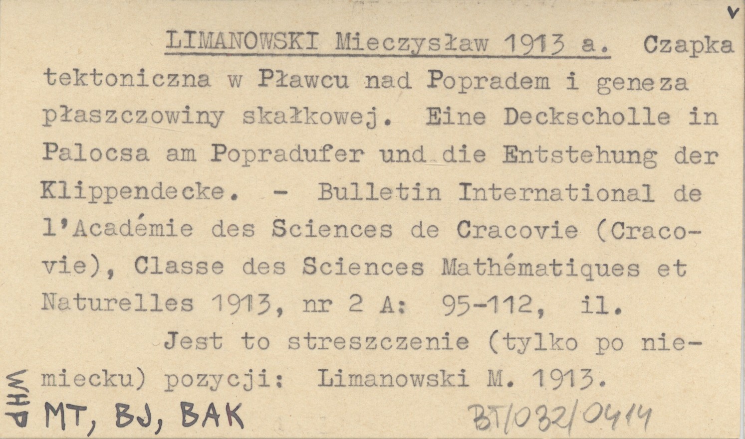 LIMANOWSKI Mieczysław 1913 a Czapka tektoniczna w Pławcu nad Popradem i geneza płaszczowiny skałkowej. Eine Deckscholle in Palocsa am Popradufer und die Entstehung der Klippendecke.
