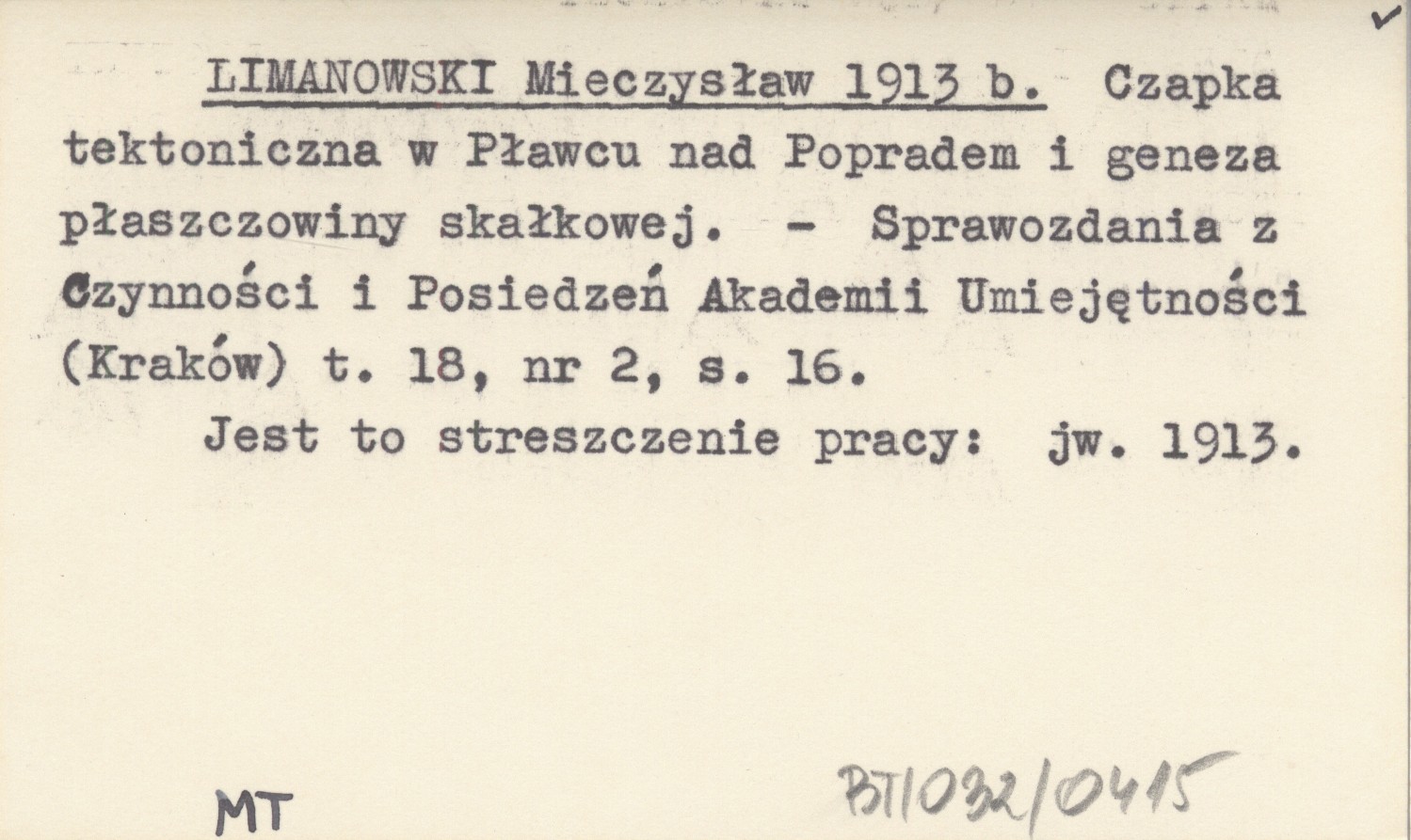 LIMANOWSKI Mieczysław 1913 b Czapka tektoniczna w Pławcu nad Popradem i geneza płaszczowiny skałkowej.