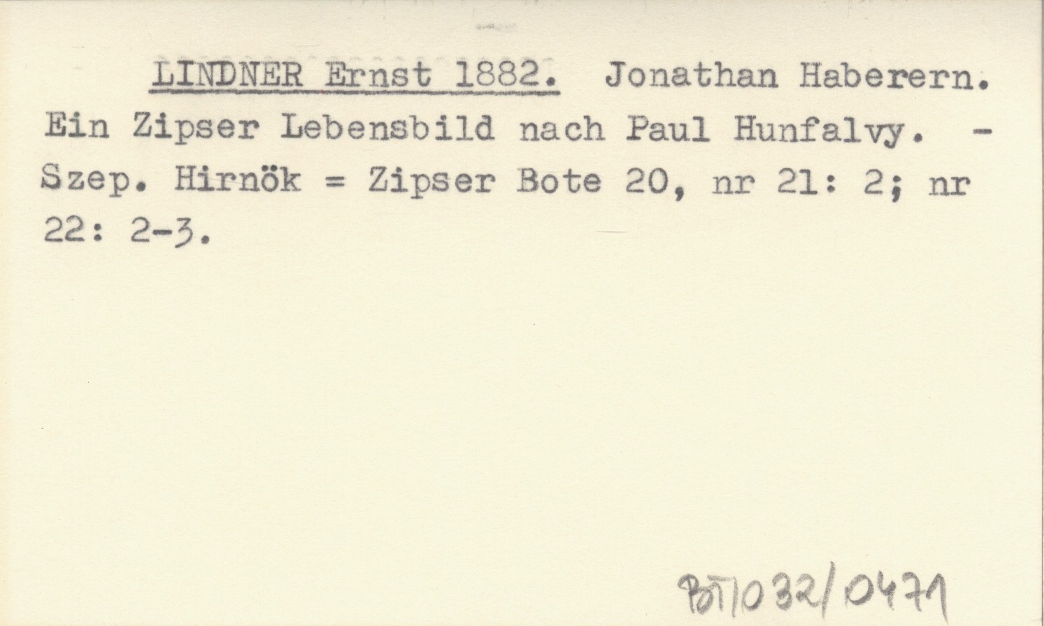 LINDNER Ernst 1882 Jonathan Haberern. Ein Zipser Lebensbild nach Paul Hunfalvy.