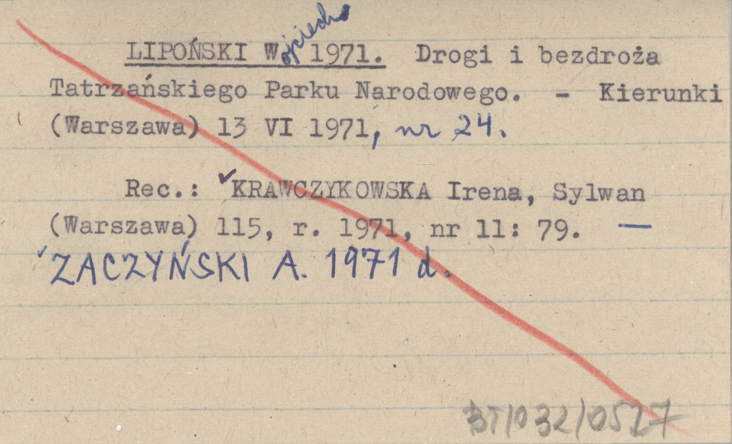 Kierunki (Warszawa) , 13 VI 1971, nr 24. REC: KRAWCZYKOWSKA Irena, Sylwan (Warszawa) 115, r. 1971, nr 11: 79 ; ZACZYŃSKI A. 1971 d ;