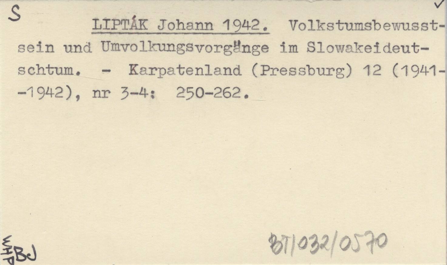 LIPTÁK Johann 1942 Volkstumsbewusstsein und Umvolkungsvorgänge im Slowakeideutschtum.