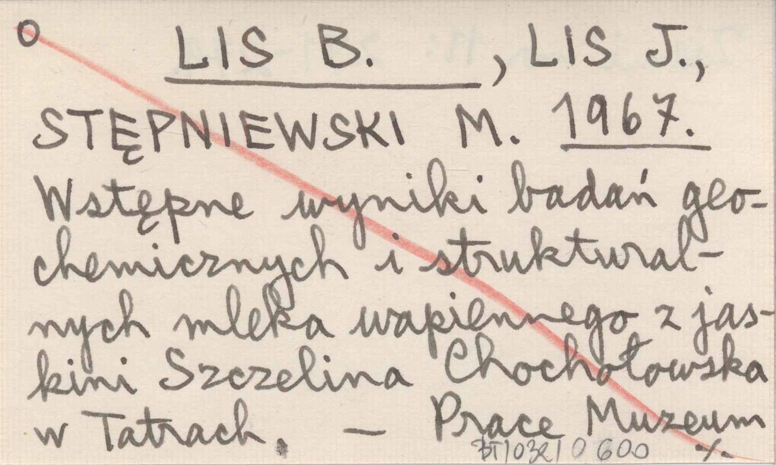 LIS B. LIS, J. ; STĘPNIEWSKI, M. ; 1967 Wstępne wyniki badań geochemicznych i strukturalnych mleka wapiennego z jaskini Szczelina Chochołowska w Tatrach.