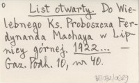 List otwarty. Do Wielebnego Ks. Proboszcza Ferdynanda Machaya w Lipnicy górnej. 1922...