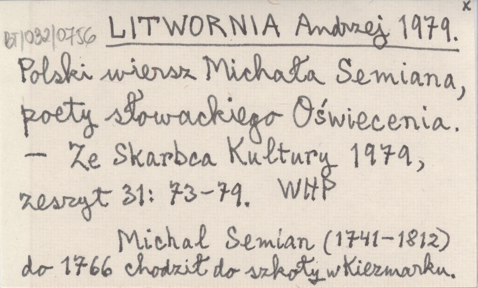 LITWORNIA Andrzej 1979 Polski wiersz Michała Semiana, poety słowackiego Oświecenia.