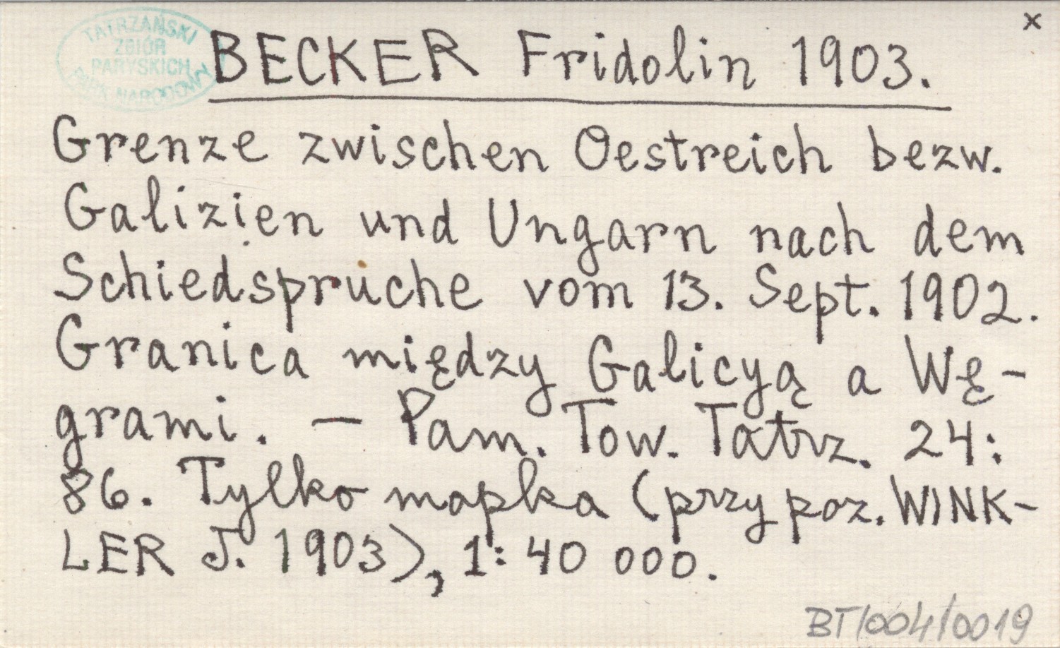BECKER Fridolin 1903 Grenze zwischen Oestreich bezw. Glizien und Ungarn nach dem Schiedspruche vom 13. Sept. 1902. Granica między Galicyą a Węgrami.