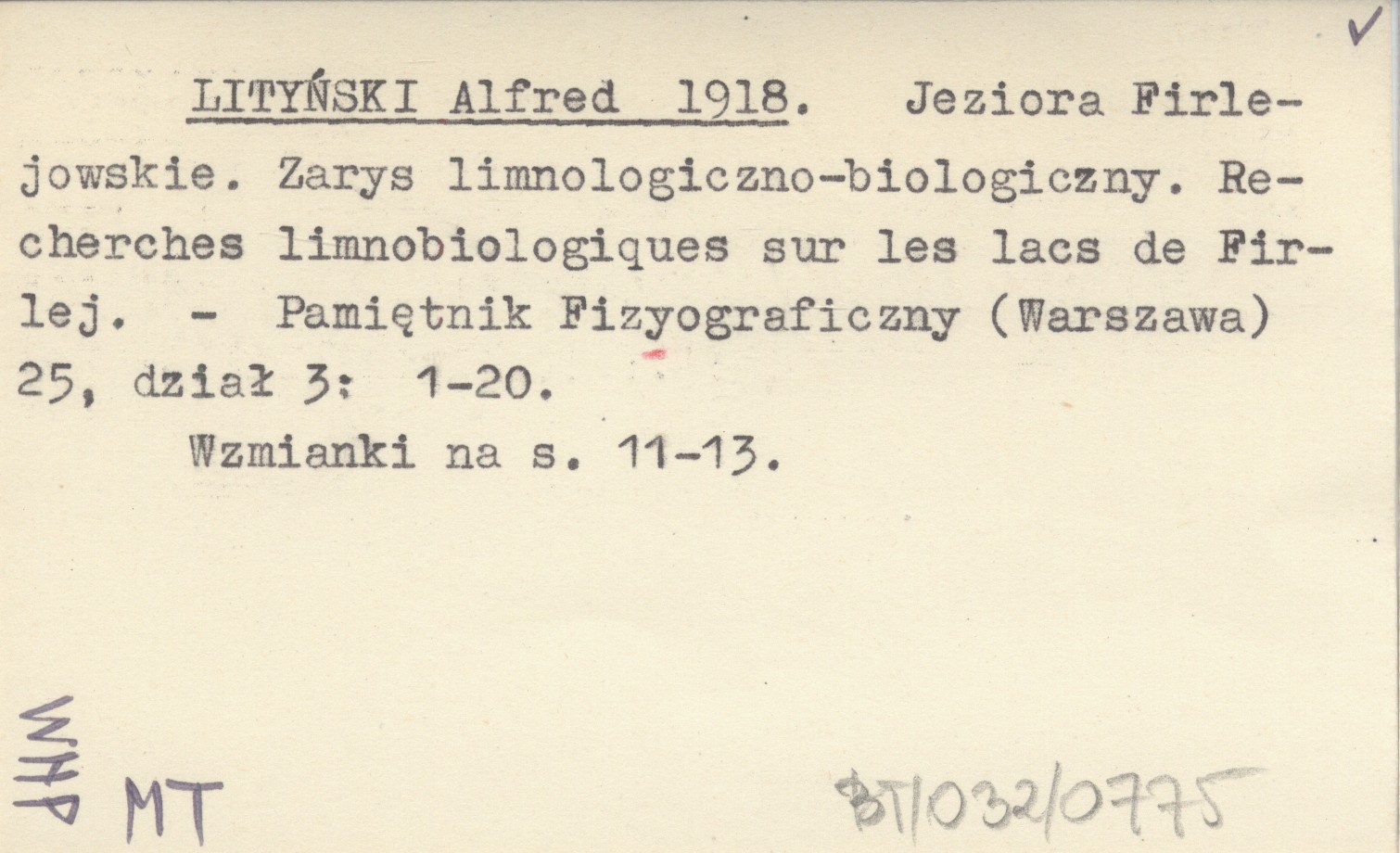 LITYŃSKI Alfred 1918 Jeziora Firlejowskie. Zarys limnologiczno-biologiczny. Recherches limnobiologiques sur les lacs de Firlej.