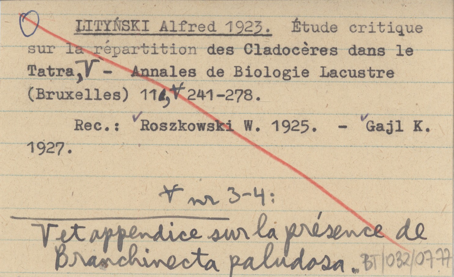 LITYŃSKI Alfred 1923 Étude critique sur la répartition des Cladocéres dans le Tatra, et appendice sur la présence de Branchinecta paludosa.