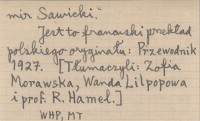 Cracovie , 9 s., 342, 19 (cz. info.), il., 9 k. tabl., okł., 17x12 cm. Red. Ludomir Sawicki. Jest to francuski przekład polskiego oryginału: Przewodnik 1927. [Tłumaczyli: Zofia Morawska, Wanda Lilpopowa i prof. R. Hamel.]