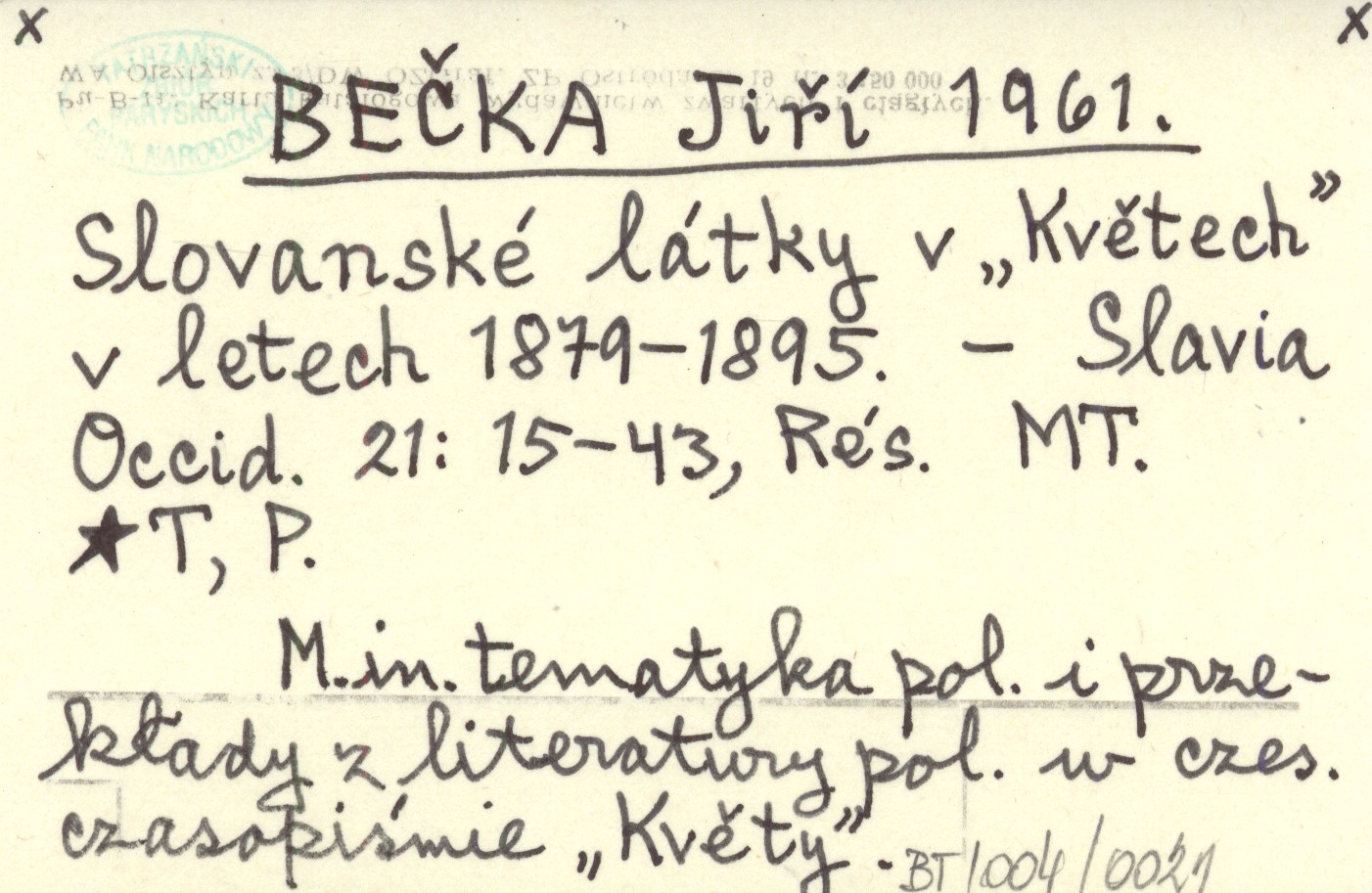 Slavia Occid., 21: 15-43, Rés. M. in. tematyka pol. i przekłady z literatury pol. w czes. czasopiśmie "Květy".