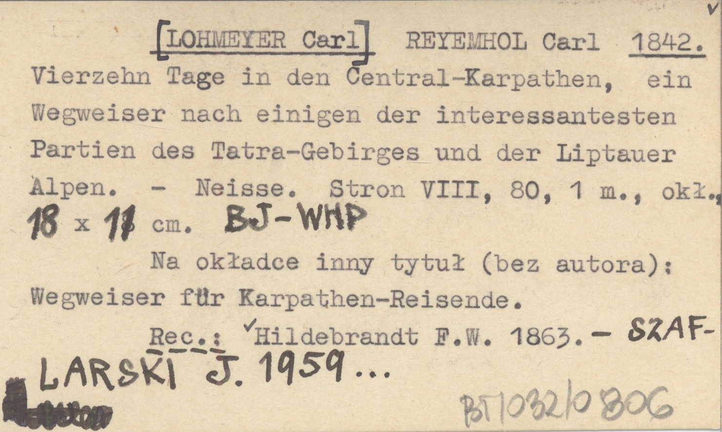 Neisse , 8 s., 80, 1 m., okł., 18x11 cm. Na okładce inny tytuł (bez autora): Wegweiser für Karpathen-Reisende. REC: HILDEBRANDT F. W. 1863 ; SZAFLARSKI J. 1959... ;