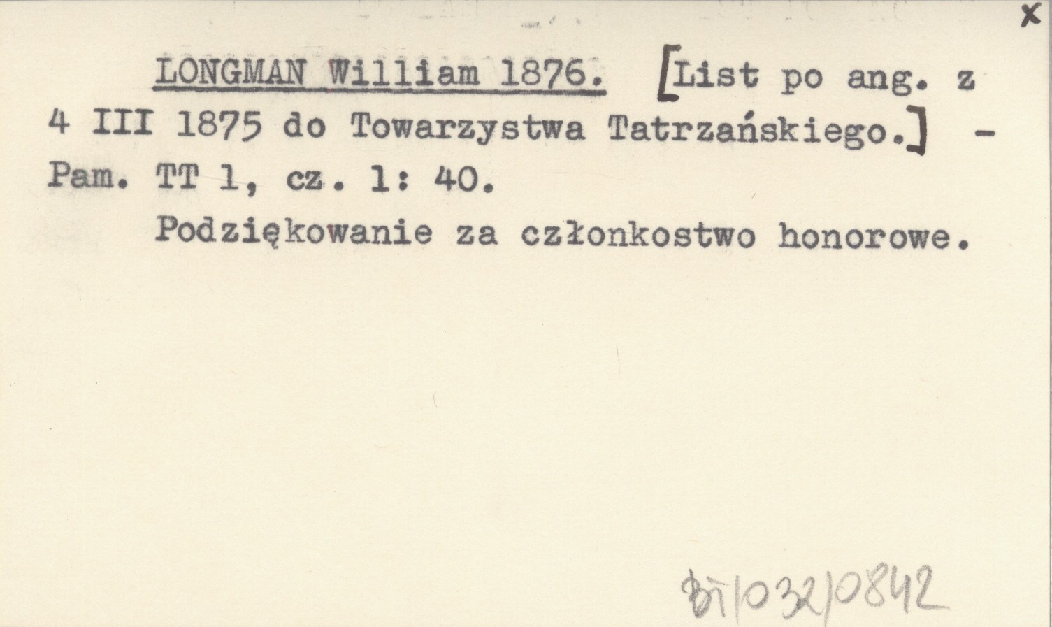 LONGMAN William 1876 [List po ang. z 4 III 1875 do Towarzystwa Tatrzańskiego.].