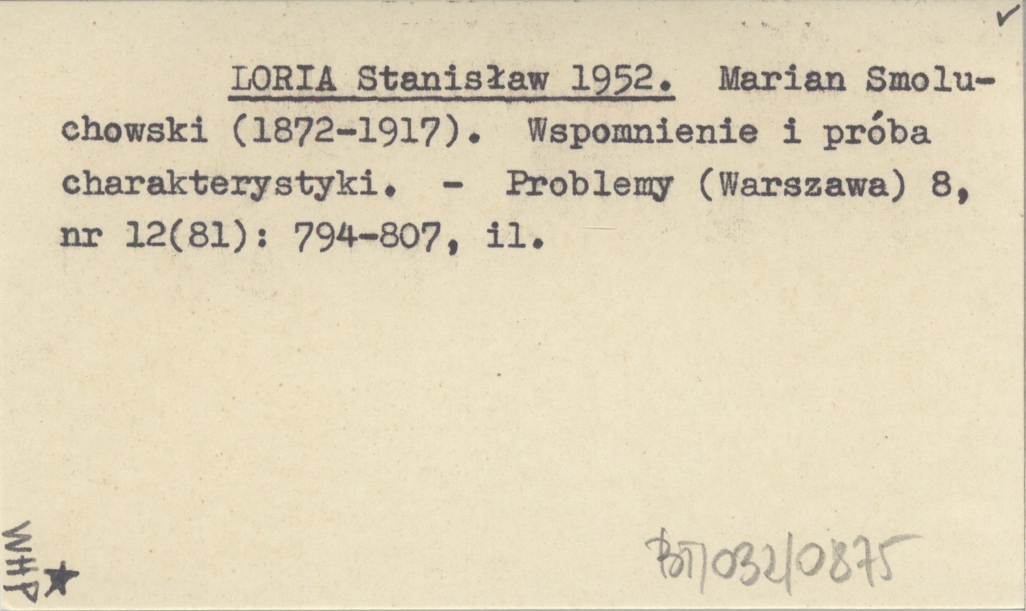 LORIA Stanisław 1952 Marian Smoluchowski (1872-1917). Wspomnienie i próba charakterystyki.
