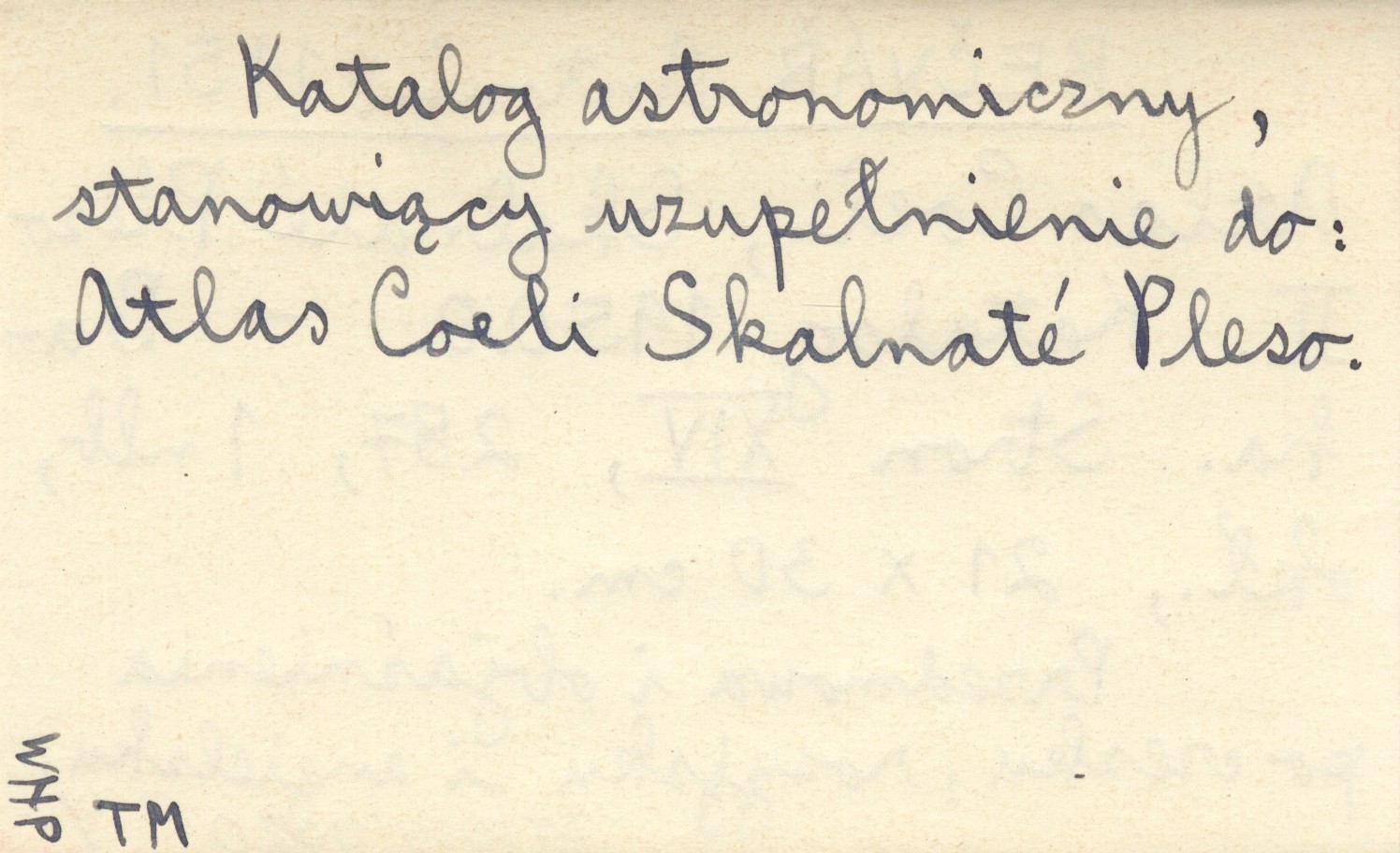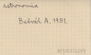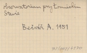 Praha , XIV, 287, [1] s., okł., 21x30 cm. Przedmowa i objaśnienia po czesku, rosyjsku i angielsku. Katalog astronomiczny, stanowiący uzupełnienie do: Atlas Coeli Skalnaté Pleso.