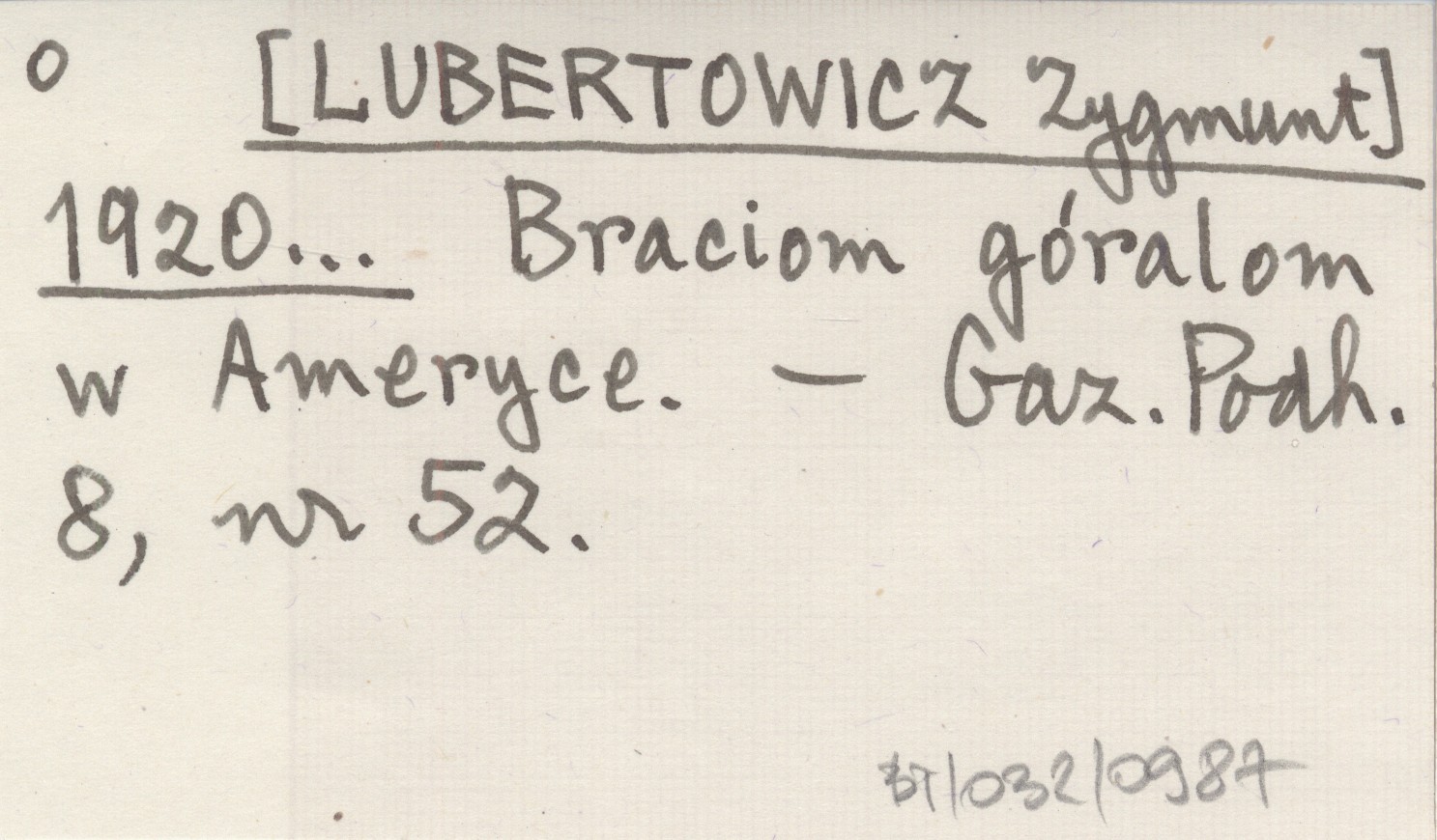 [LUBERTOWICZ Zygmunt] 1920... Braciom góralom w Ameryce.