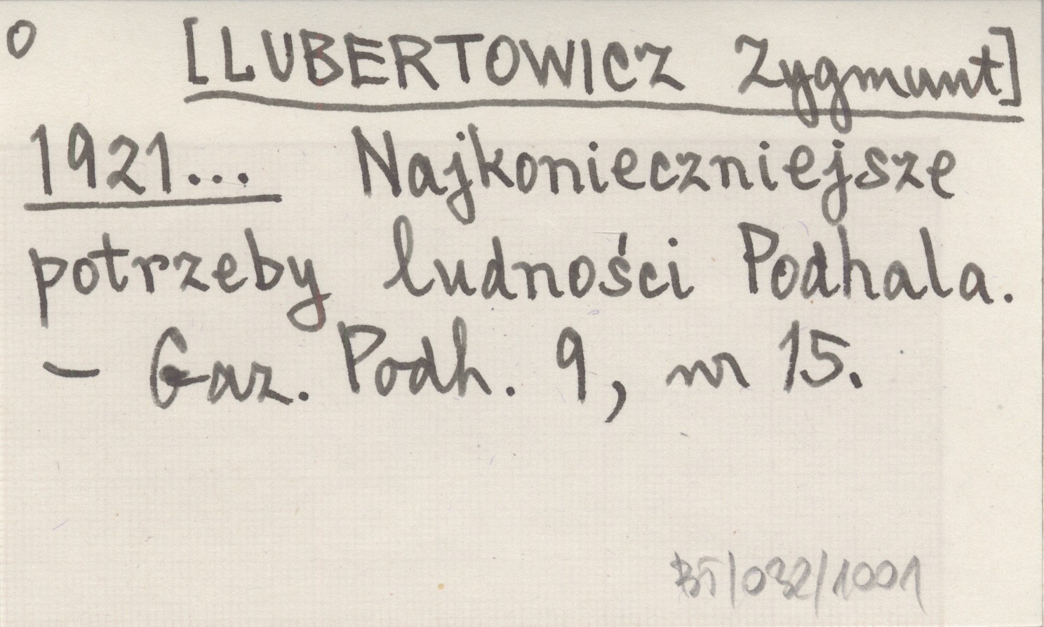[LUBERTOWICZ Zygmunt] 1921... Najkonieczniejsze potrzeby ludności Podhala.