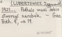 [LUBERTOWICZ Zygmunt] 1921... Podhale musi sobie stworzyć zarobek.