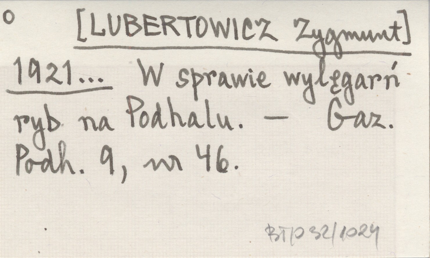 [LUBERTOWICZ Zygmunt] 1921... W sprawie wylęgarń ryb na Podhalu.