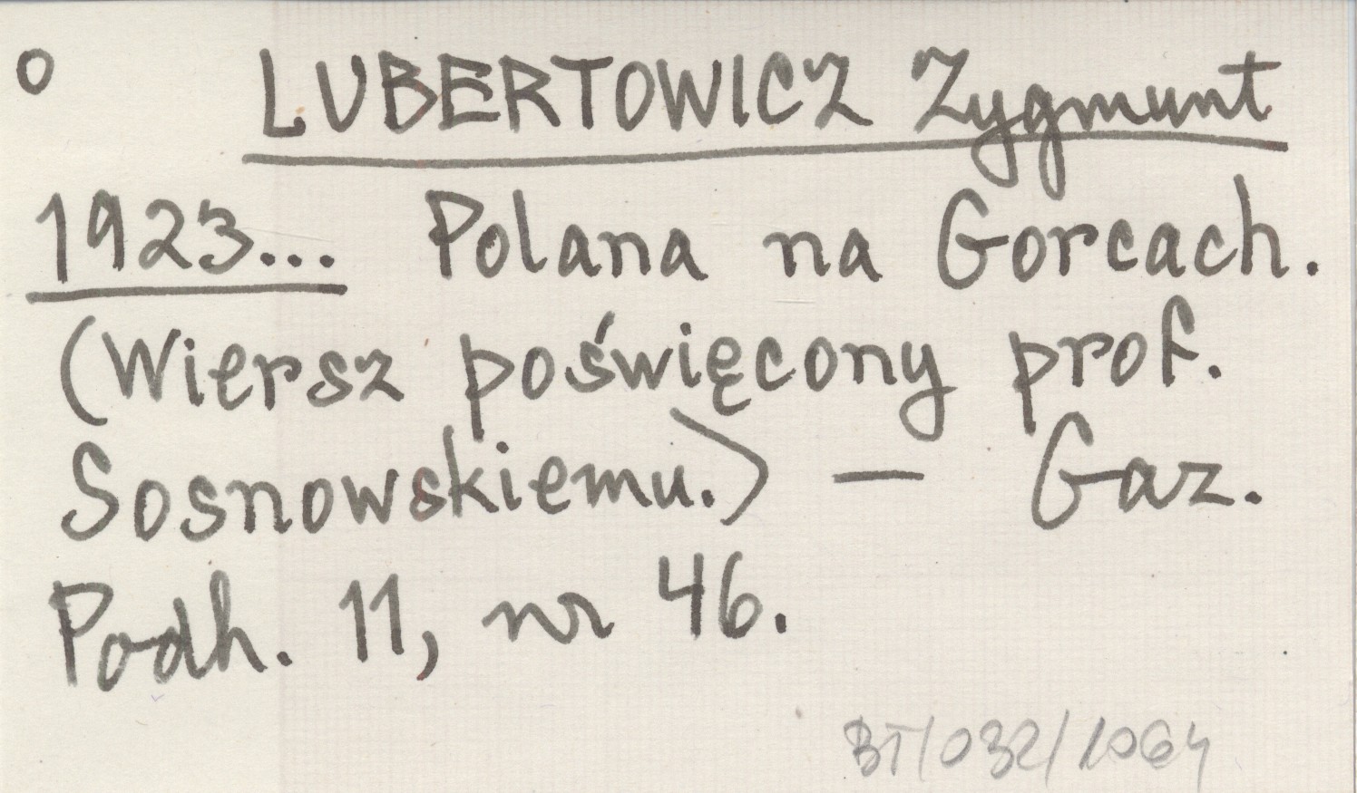 LUBERTOWICZ Zygmunt 1923... Polana na Gorcach. (Wiersz poświęcony prof. Sosnowskemu.).