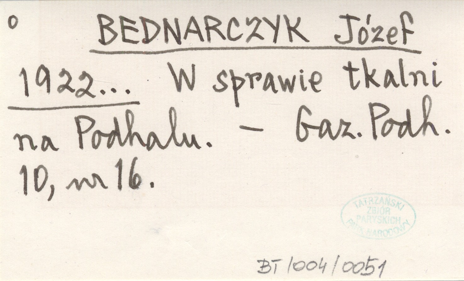 BEDNARCZYK Józef 1922... W sprawie tkalni na Podhalu.