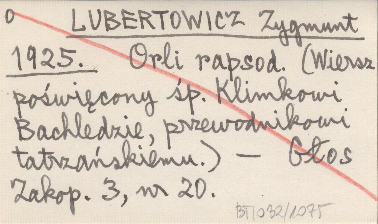 LUBERTOWICZ Zygmunt 1925 Orli rapsod. (Wiersz poświęcony śp. Klimkowi Bachledzie, przewodnikowi tatrzańskiemu.).