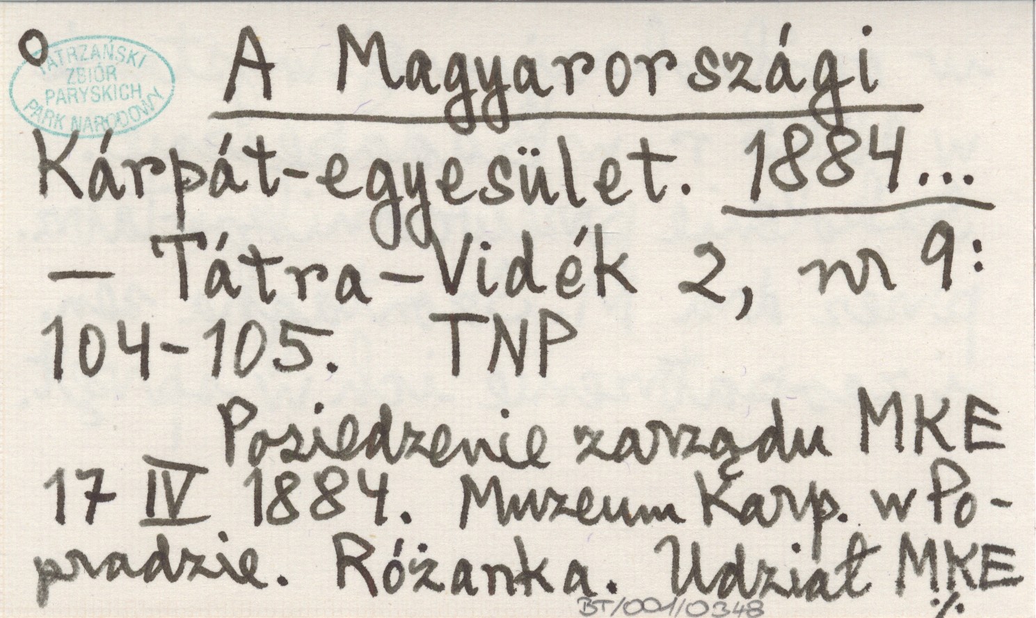 Tátra-Vidék, 2, nr 9: 104-105. Posiedzenie zarządu MKE 17 IV 1884. Muzeum Karp. w Popradzie. Różanka. Udział MKE w ogólnokrajowej wystawie w 1885 r. w Budapeszcie. Szkolenie przewodników tatrz. przez dra M. Szontagha sen. i zaopatrzenie ich w sprzęt.
