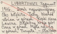 LUBERTOWICZ Zygmunt 1926 Druh najwierniejszy. Oko błękitu. Tatry. Wschód słońca w górach. Kopki siana. Lawina. Błękitny kraju gór! Cisza w górach. Mgła ranna w górach. Turysta.
