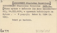 LUBOMIRSZKY Stanislaus Heraclius [LUBOMIRSKI Stanisław Herakliusz] 1674 b [Pismo wydane w Łańcucie (in Arce Lanczhuthensi), 14.III.1674, w sprawach kościelnych na Spiszu.