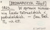 [BEDNARCZYK Józef] 1923... W sprawie niszczenia lasów tatrzańskich i podhalańskich.