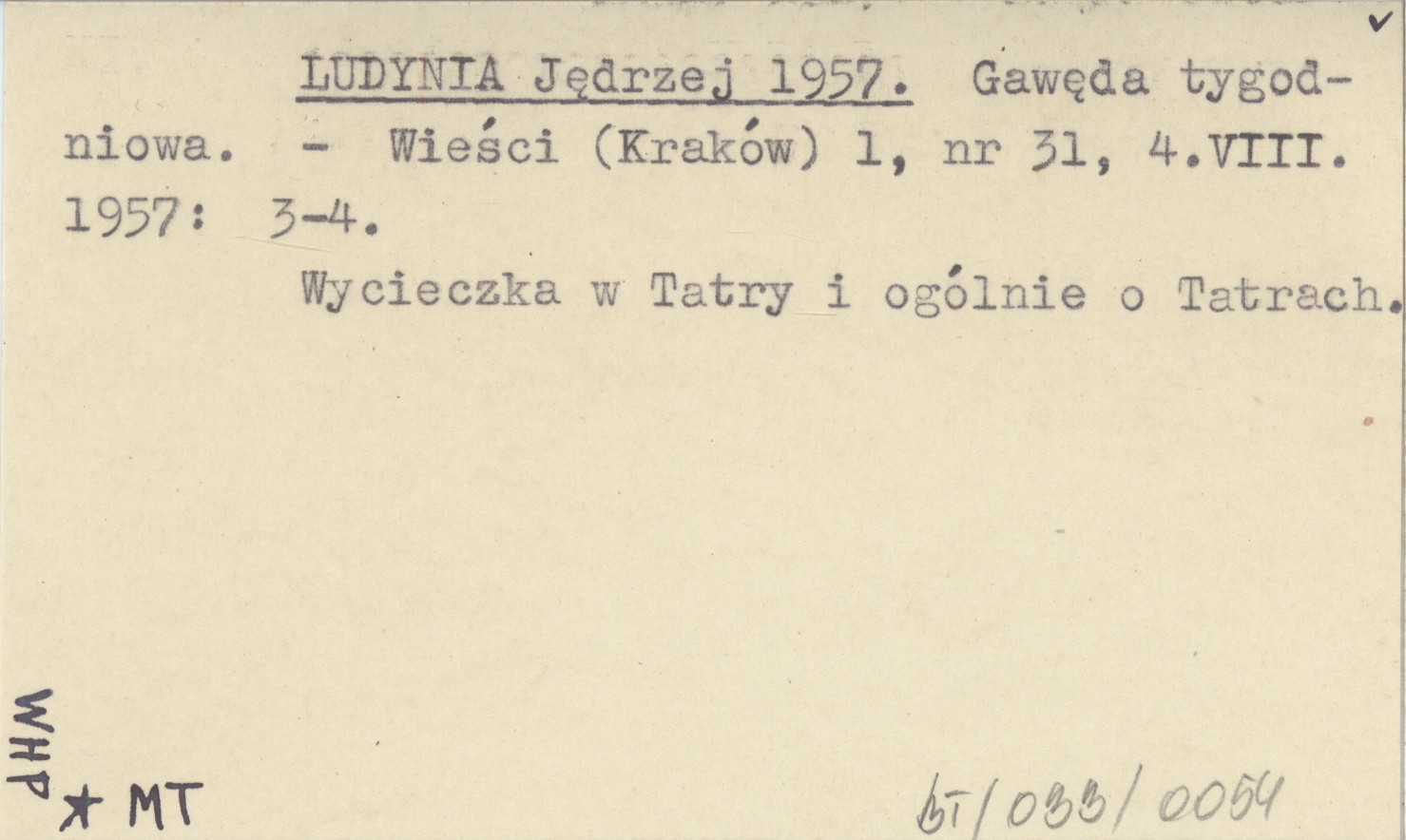 Wieści (Kraków) , 1, nr 31, 4 VIII 1957: 3-4. Wycieczka w Tatry i ogólnie o Tatrach.