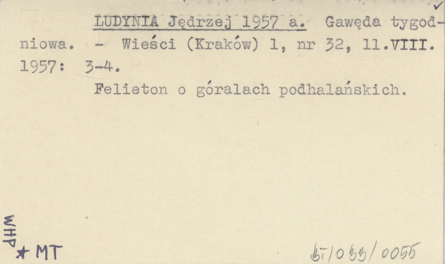 Wieści (Kraków) , 1, nr 32, 11 VIII 1957: 3-4. Felieton o góralach podhalańskich.