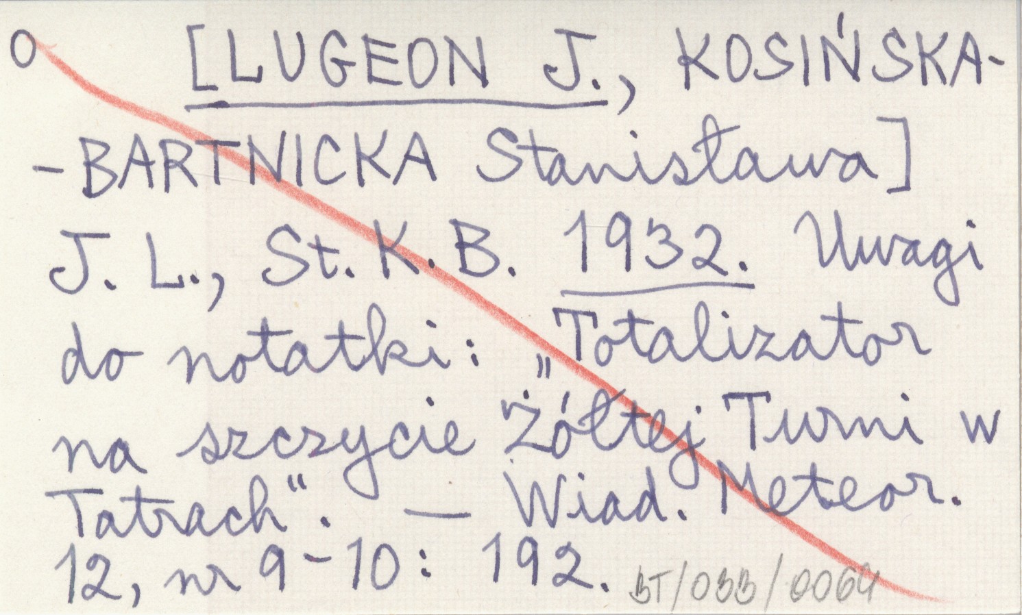 J. L., St. K. B. [LUGEON J.] [KOSIŃSKA-BARTNICKA, Stanisława]. ; 1932 Uwagi do notatki: "Totalizator na szczycie Żółtej Turni w Tatrach".