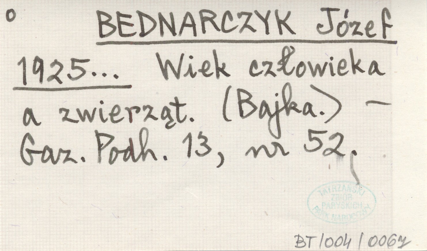 BEDNARCZYK Józef 1925... Wiek człowieka a zwierząt. (Bajka.)