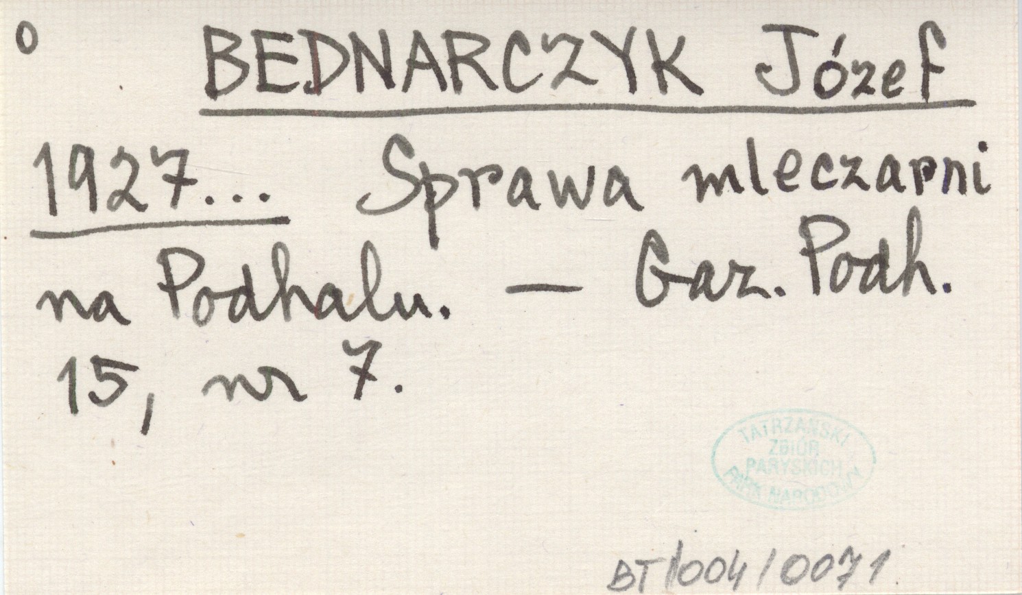 BEDNARCZYK Józef 1927... Sprawa mleczarni na Podhalu.